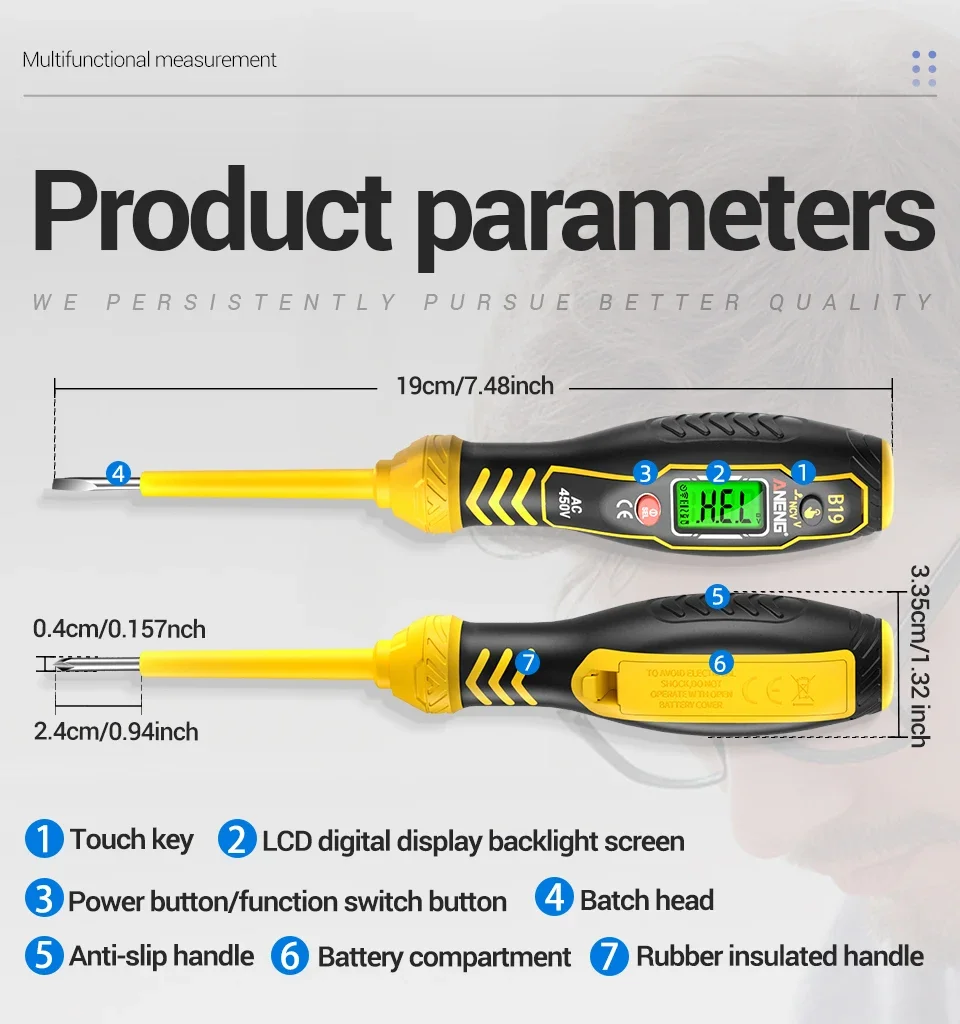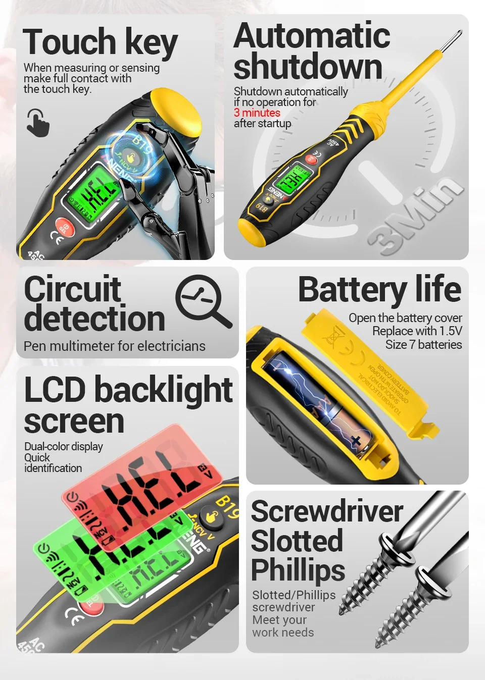 I was looking for a new phase finder screwdriver and I am not disappointed. This model even allows you to detect phases at a distance without touching them. For 'security' sockets, it's practical. The screwdriver is insulated like an electrician's screwdriver, which is reassuring. Super product for me 👍